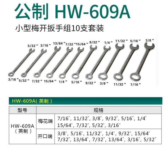 宝工两用开口扳手双头扳手HW-609B 4mm-12mm梅花扳手开口扳手套装10支 英制HW-609A 10支