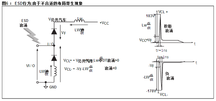 如果我们考虑到从引线V的连接公共汽车到VCC从GND到GND PCB用做两首曲目为10mm长, 0.5毫米大;我们假设寄生电感,这些磁道Lw中大约6NH 。因此,当一个IEC61000-4-2浪涌发生时,由于该尖峰的上升时间(tr = 1ns的),则电压VCL有一个额外的价值等于Lw.dI / DT 。的di / dt的计算公式为:的di / dt = IP / TR = 24 A / NS由于寄生电感的过电压是: Lw.dI / dt的= 6× 24 = 144V通过考虑这些寄生电感的影响是由于不合适的布局中,夹紧电压将是: