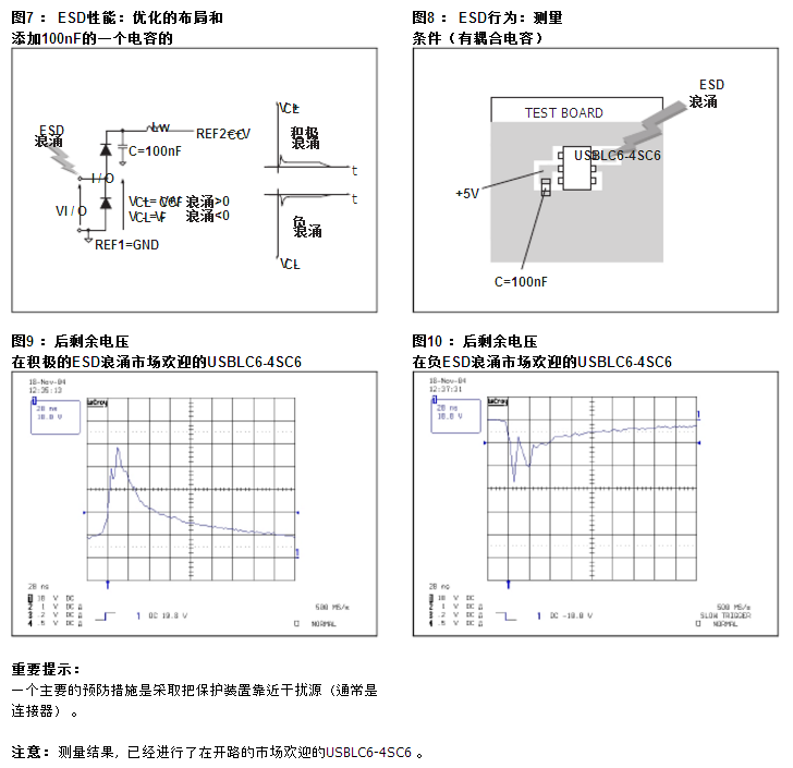为了确保相同的效率,积极激增时连接不能足够短,我们建议将接近市场欢迎的USBLC6-4SC6 ,V之间公共汽车和地面, 100nF的对一个电容防止这类过电压干扰(参见图7) 。这种电容的添加将允许更好的保护浪涌恒定电压时提供。在图8,9和10示出了ESD保护的改进,根据提出的建议如上所述。