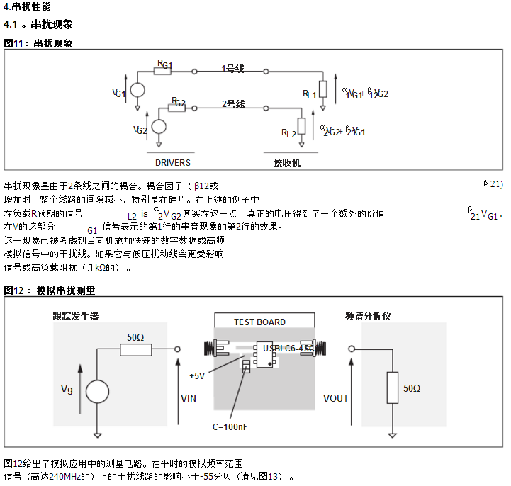 我们假设钳位二极管的动态电阻的值通常是:Rd= 1.4Ω和VT= 1.2V.对于IEC61000-4-2浪涌4级(接触放电: Vg= 8千伏,Rg=330Ω), V公共汽车= + 5V ,如果在第一近似,我们假设:我p= Vg/ Rg= 24A.所以,我们发现:VCL+ = +39VVCL- = -34V