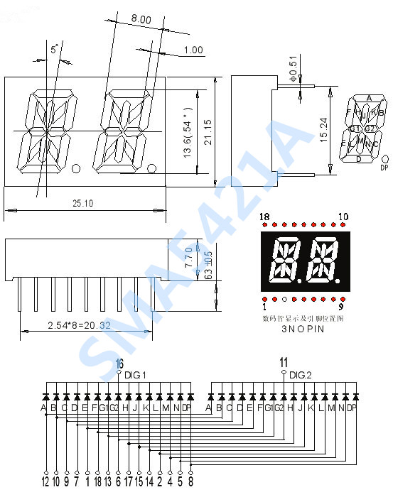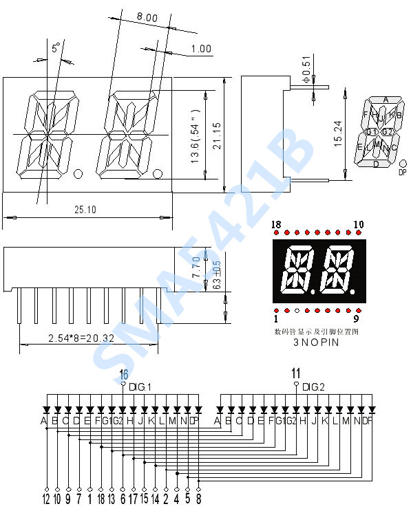 | 尺寸规格: 0.54英寸2位米字型 | ||||||||||||