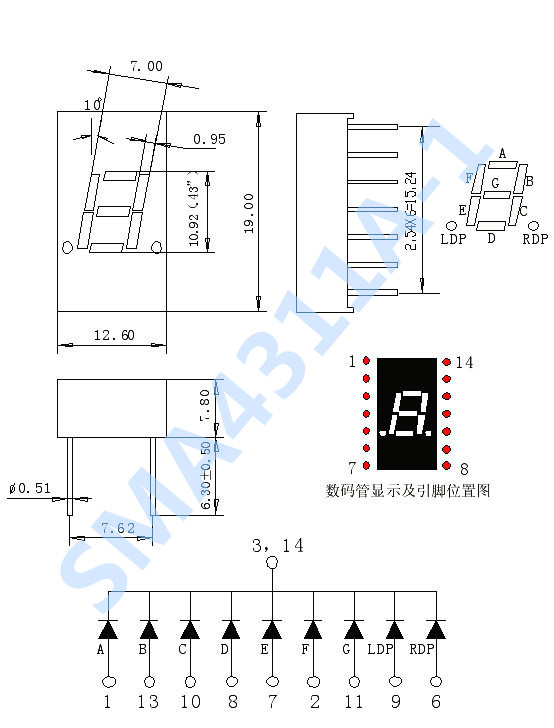 led数码管(LED Segment Displays)由多个发光二极管封装 在一起组成“8”字型的器件,引线已在内部连接完成,只需 引出它们的各个笔划,公共电极。数码管实际上是由七个发光 管组成8字形构成的,加上小数点就是8个。这些段分别由字母 a,b,c,d,e,f,g,dp来表示。