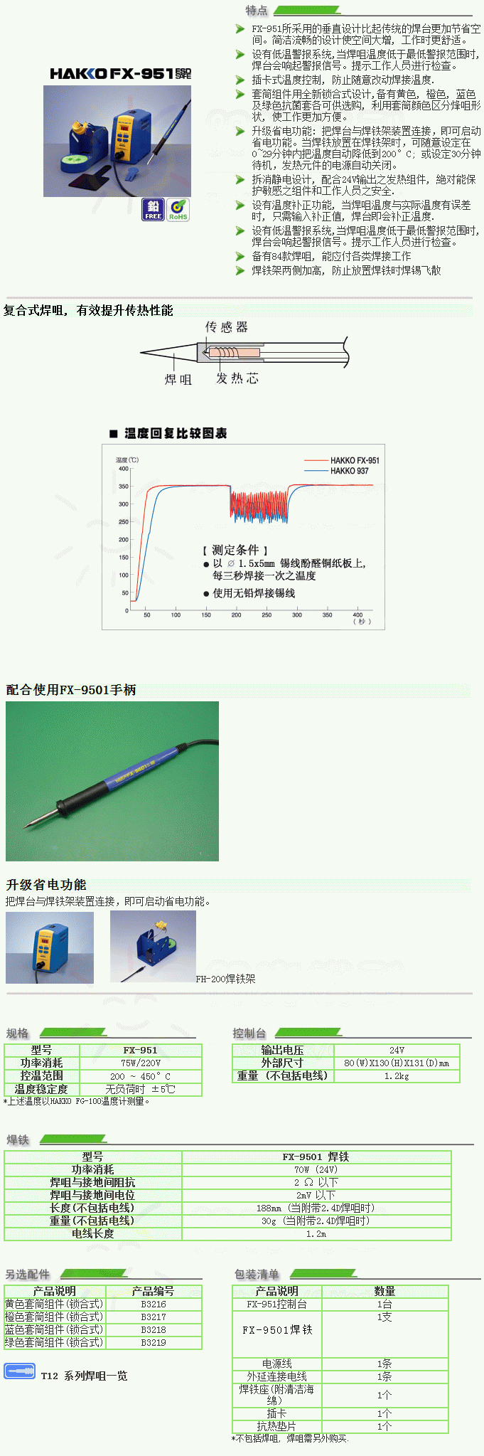 漂亮、高性能的日本白光FX-951焊台。漂亮紧凑的外形。高性能、数字显示、防静电。精密数字控制,烙铁头温度调节可以精确到1度。高科技创新的复合式烙铁头(测温、加热芯一体式),目前国内还无焊台厂家能仿制。适合爱好焊接的工具爱好者。