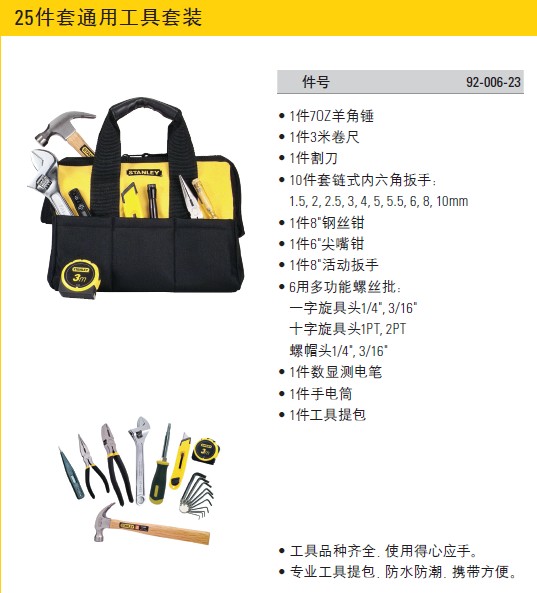 • 商品名称: STANLEY史丹利 25件套通用工具套装 92-006-23 机修/家用工具组套
