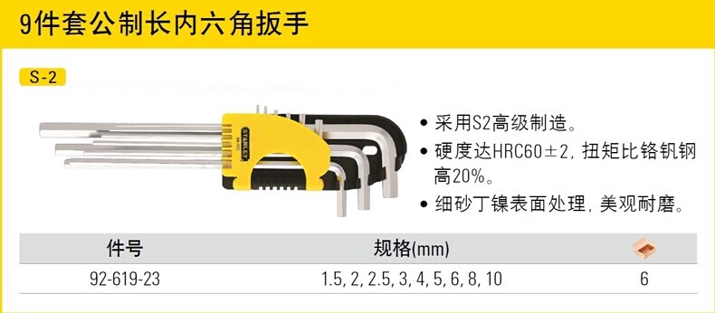 • 商品名称: STANLEY/史丹利 9件套公制加长内六角扳手94-160-23 长平头92-619-23