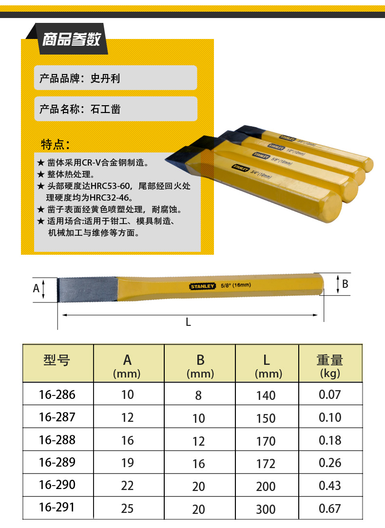STANLEY/Stanley/史丹利 石工凿 16-286-1-23 冲凿 加硬钢凿 泥水石头凿 16-286-1-23