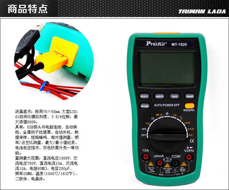 • 具有:USB接头与电脑连线、自动换档、金属抗干扰遮罩、自动关机、数据保持、短路蜂鸣、相对值测量、频率/占空比测量、最大/最小值纪录、电池低压指示、双色防震外壳…等功能。