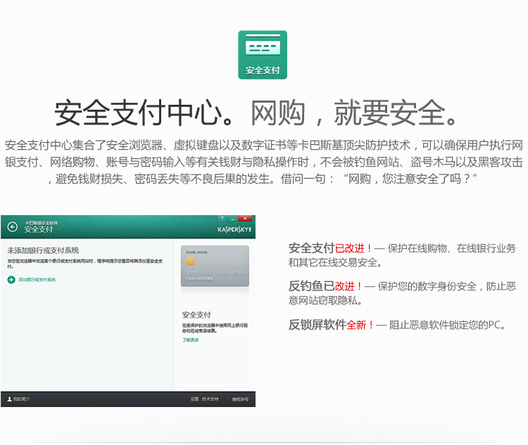 我们在线联网花费的时间越多,就越容易落入网络罪犯的攻击之中。对此,网络罪犯们了然于心。 网络威胁正以更快的速度变得愈发智能与复杂。如今,大多数恶意软件以窃取我们的钱财或个人数据为目的。 为了应对不断增长的各种威胁,卡巴斯基安全软件针对在线威胁提供高级保护,全面抵御用户身份、隐私、财产和家人安全,令用户安心无忧地使用在线银行、购物与交流。