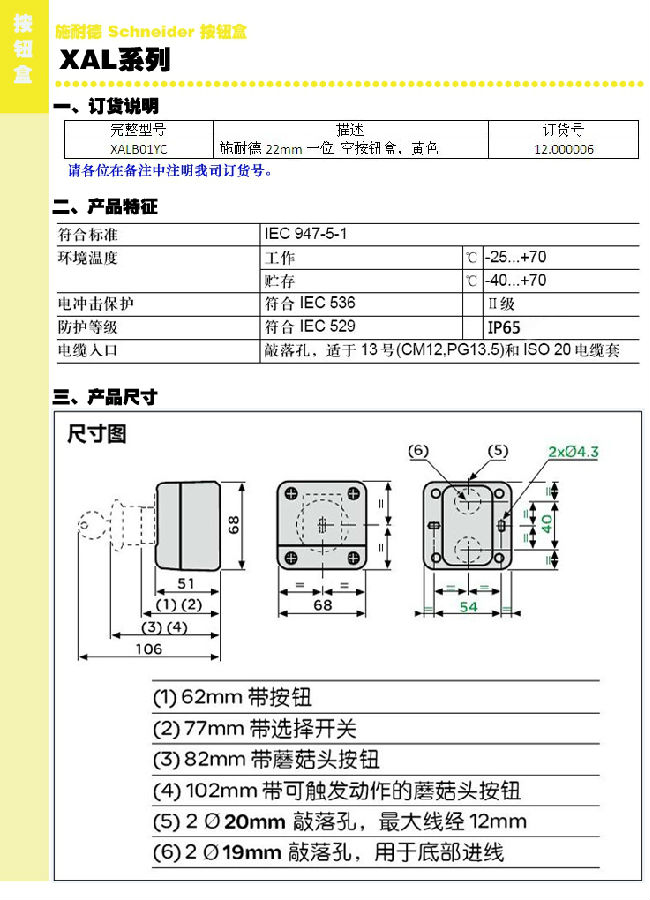 施耐德按钮盒 1孔 急停按钮盒 空盒 22mm孔径 IP65 XALB01YC