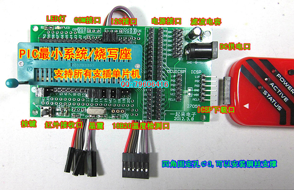 方便用户开发,支持所有直插封装的PIC单片机。板子尺寸:106*52MM 双面板 现在发货都是红油白字电路板(不是下面的绿色版) 版面更加清晰!