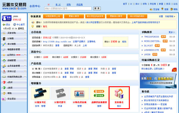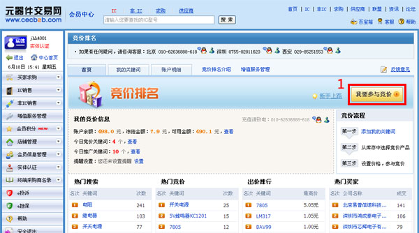 1、开通服务后,登录会员中心,点击首页增值服务“竞价”(或左侧菜单“增值服务管理”,点击“我要竞价”)进入竞价排名首页。