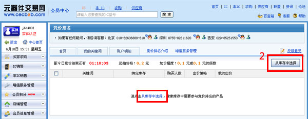 2、点击“我要参与竞价”,从您发布的库存中选择要参与竞价的库存,并设置关键词,每次可以选择多条,进行批量竞价。