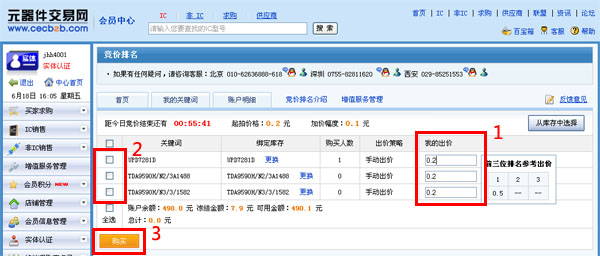 1、在关键词出价页面,对已选择的关键词一一出价,输入框右侧会显示当前关键词的前3名参考价格,最后点击“购买”按钮结束整个流程。