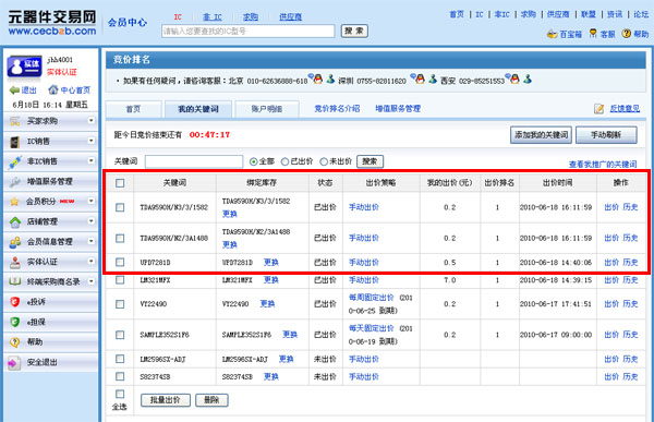 竞价排名是元器件交易网为通过实体认证的会员全新打造的一款搜索结果排名服务。当用户搜索某产品关键词时,竞价成功此关键词的企业将按照出价高低排在搜索结果的前三位。