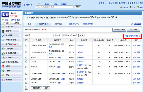 第一步:登录会员中心,进入会员中心-增值服务管理-竞价排名-我的关键词
