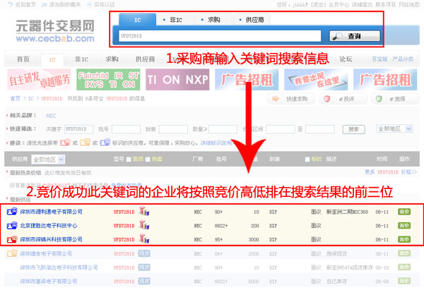 据元器件交易网统计,约80%的采购商在搜索时只查看第一页展示的信息。因此,如果您参加竞价排名,可以: