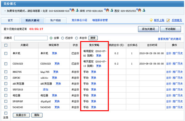 您在“我的关键词页”及“出价页”都可以操作,以出价页为例: