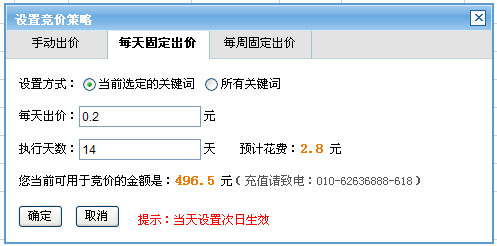 第三步:设置出价金额及执行天(周)数,点击“确定”即可